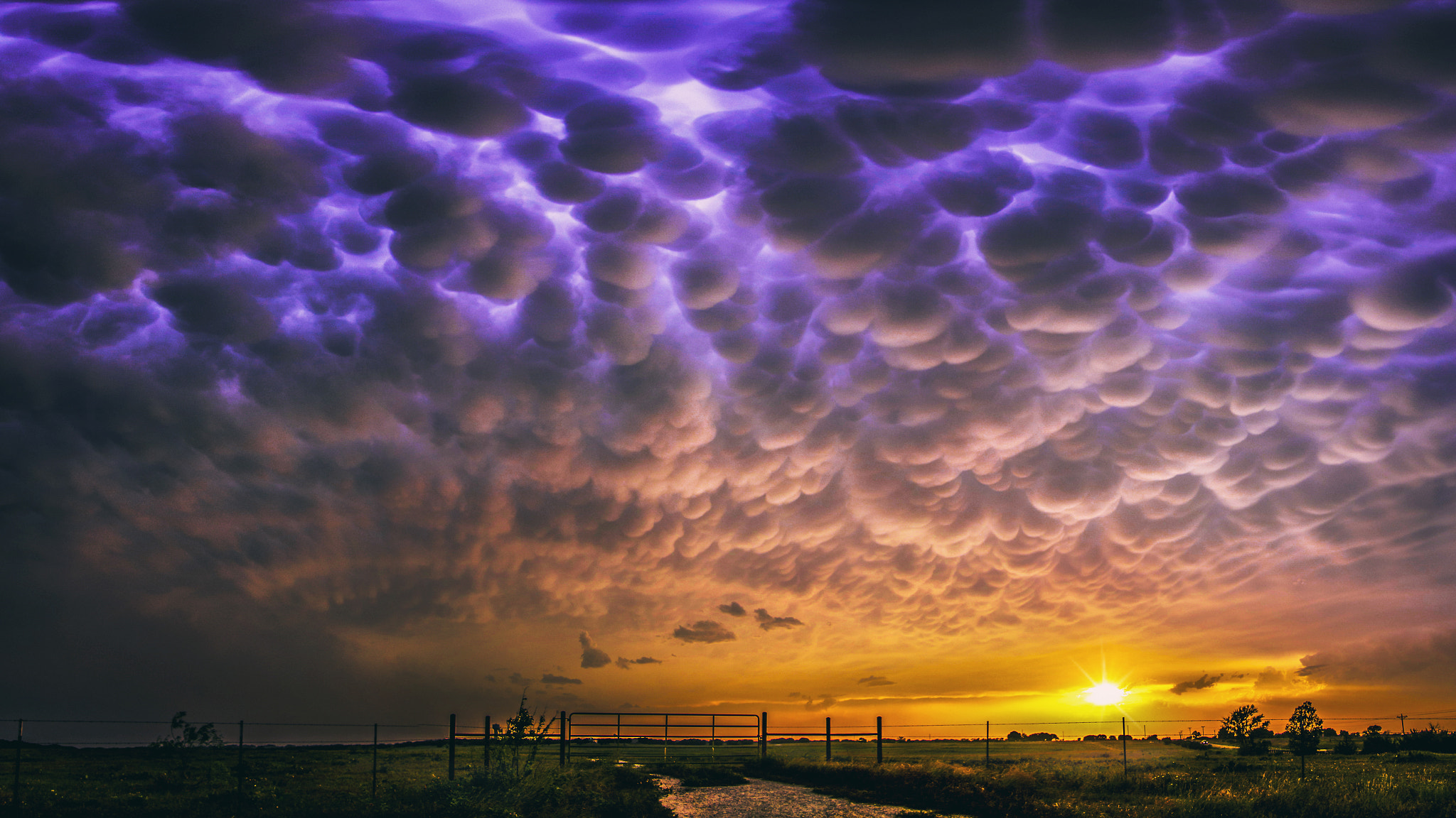 Mammatus clouds are unusual clouds formation, which are hard to confused with another, because of their unique shapes. This phenomenon can extend hundreds of miles in any direction. Mostly, Mammatus clouds are formed in association with large cumulonimbus clouds. It's interesting that "Mammatus" comes from the Latin "mamma" which translates to "udder" or "breast". What's in these "udders"? It's ice crystals and water droplets, what causes that saturated air is heavier than the surrounding air.